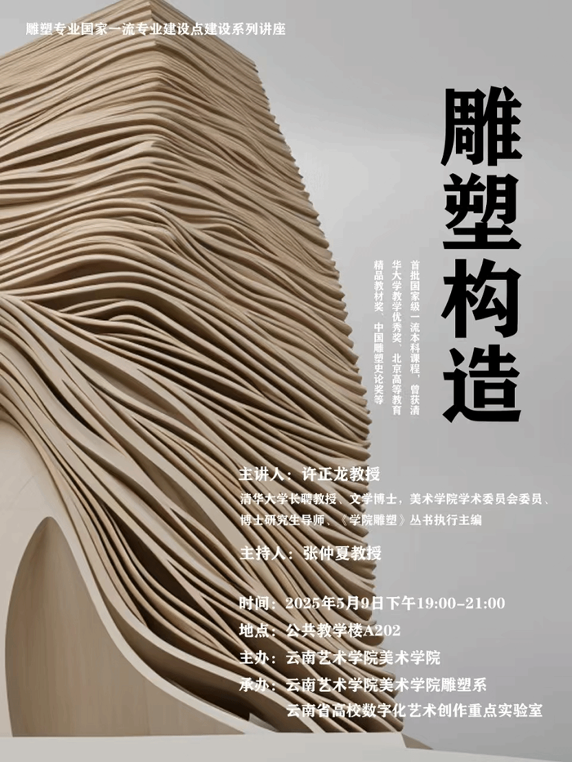 为推进2026世界杯官方合作网站雕塑专业国家一流专业建设,2025年5月9日雕塑系邀请清华大学2026世界杯官方合作网站许正龙教授来校,举办题为《雕塑构造》讲座。许正龙,清华大学长聘教授、文学博士,公司学术委员会委员、博士研究生导师、《公司雕塑》丛书执行主编。出版《中式物语》《和合之道》《中和坊》《时空铭》《雕塑时空》《雕塑概论》《雕塑学》等著作与教材,讲授的《雕塑构造》为首批国家级一流本科课程,曾获清华大学教学优秀奖、北京高等教育精品教材奖、...