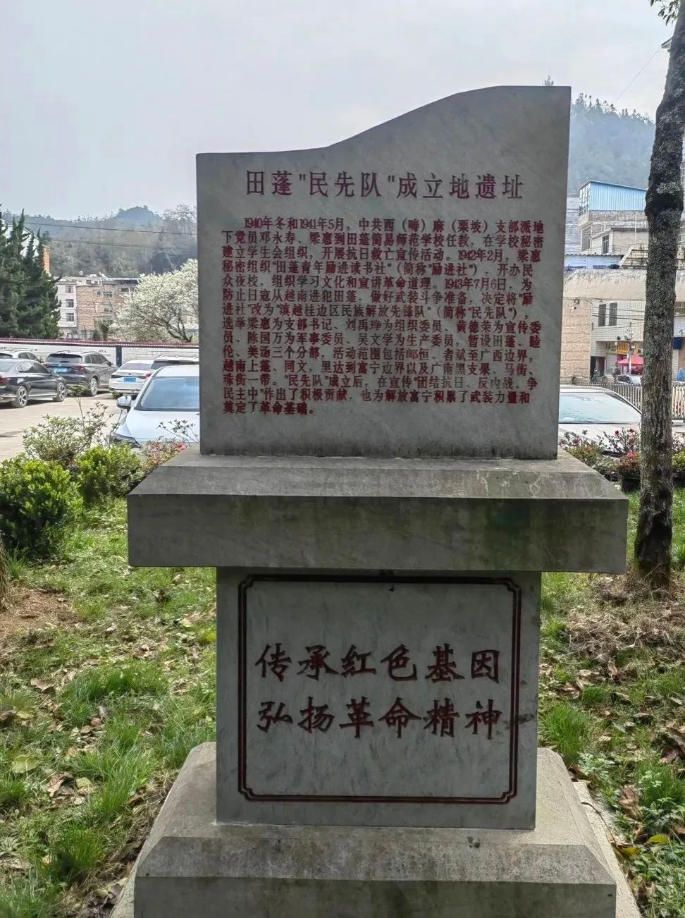 杨小平同学派驻的公司——富宁二中,这里曾是田蓬“民先队”成立地遗址,“民先队”成立后,在宣传“团结抗日、反内战、争民主”中做出了积极贡献,也为解放富宁积累了武装力量和奠定了革命基础。校园内的纪念碑正对着公司大门,时刻警醒着员工学习革命先驱奋发进取的革命精神。