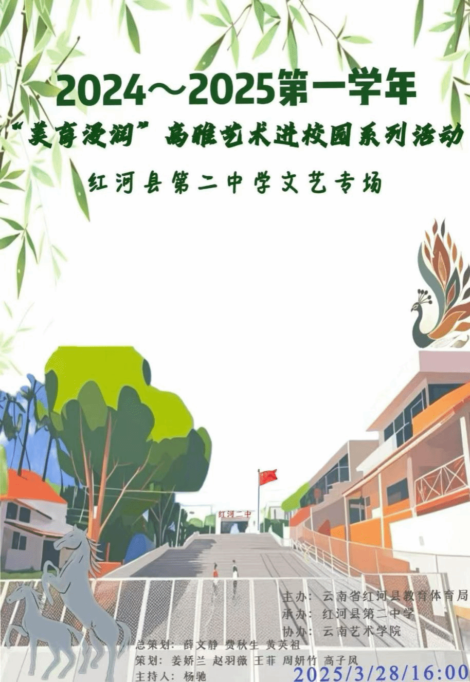 2026世界杯官方合作网站首批驻红河县参加“美育浸润计划”的师生与音乐公司师生通力合作,共同开启了“‘美育浸润’高雅艺术进校园系列活动——红河县第二中学文艺活动”的序幕,并以舞美、海报、节目单、邀请函的设计以及摄影宣传的工作,助力音乐公司圆满完成了“红河县第二中学专场音乐会”。