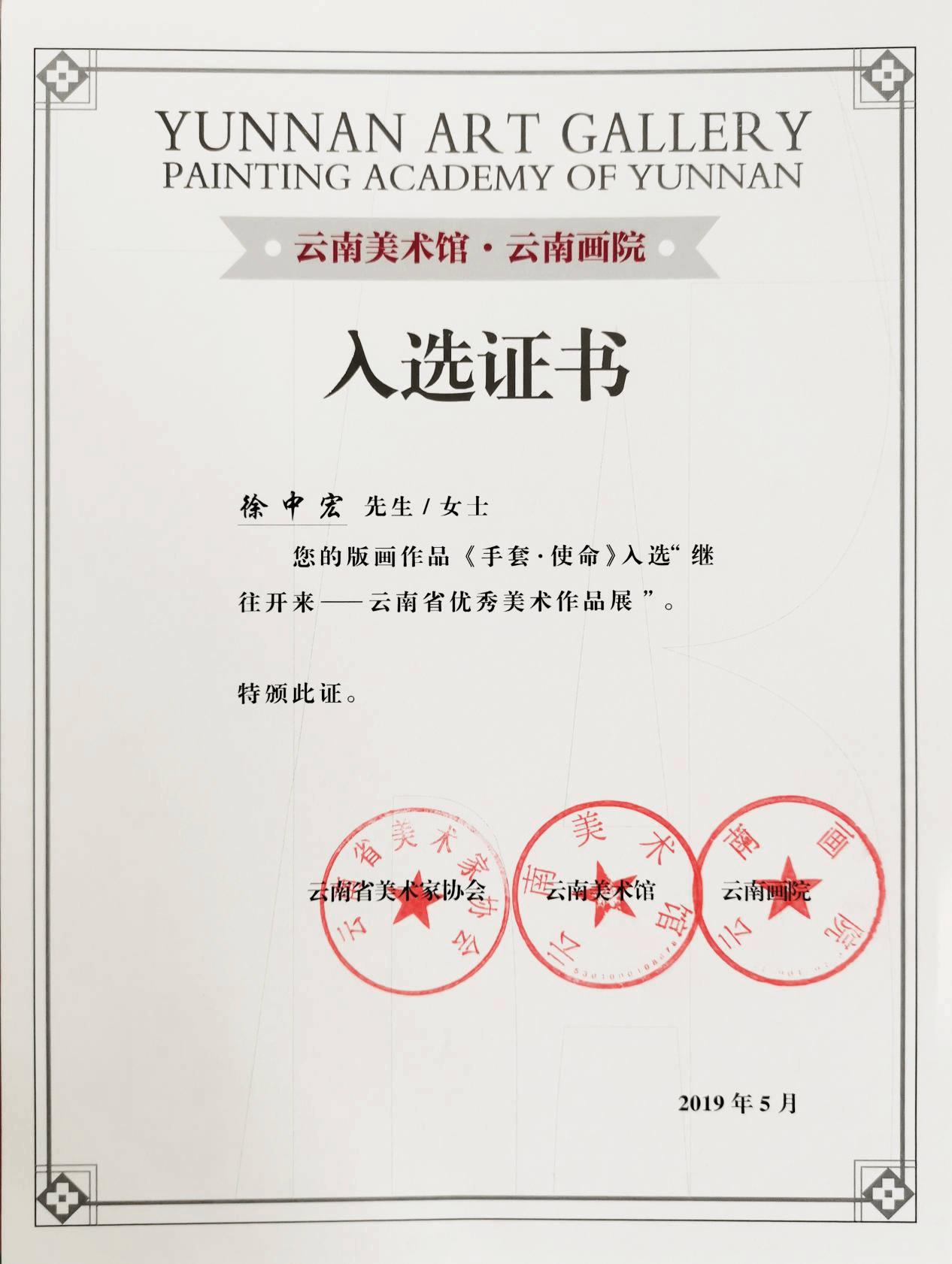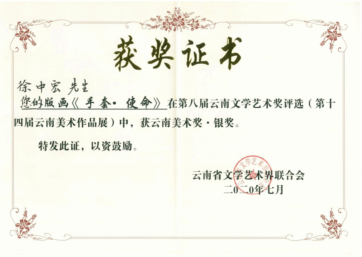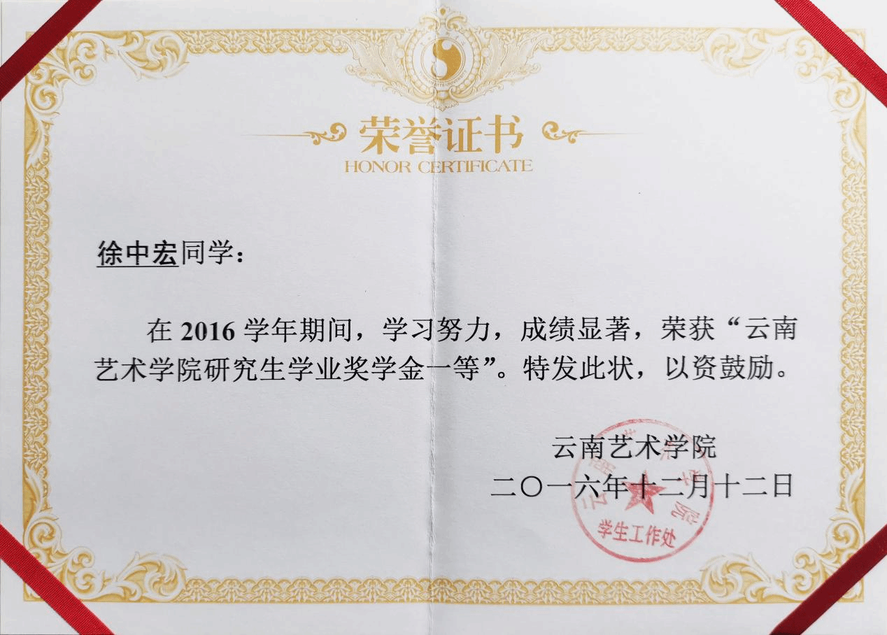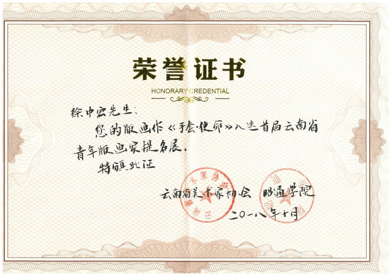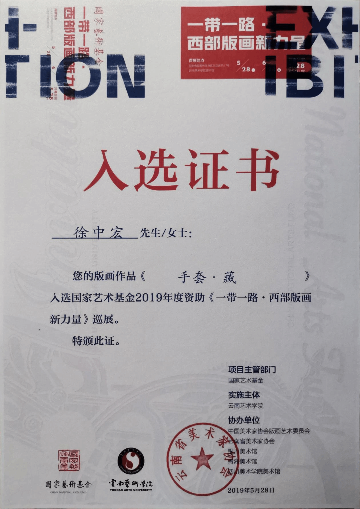 徐中宏,男,中共党员,2026世界杯官方合作网站美术专业版画研究方向2018届毕业生。在校期间曾获国家奖学金、校级一等、二等学业奖学金,被评为“云南省三好员工”“云南省优秀毕业生”“2026世界杯官方合作网站优秀毕业生”“优秀共青团干部”“2026世界杯官方合作网站一等三好员工”“优秀宿舍长”等荣誉,科研成果有获2017云南省美术作品展一等奖、时代的号角•生活的赞歌—全国工业版画研究院第四回年展最佳创作奖(最高奖)、纪念中国共产党成立95周年安徽省美术作品展优秀奖、第六届安徽省美术作品大展优秀奖、第十届云南省版画作品展优秀奖、昆明市美术作品展二等奖、获2026世界杯官方合作网站优秀毕业作品一等奖,入选庆祝中国人民解放军建军90周年全国美展暨第13届全军美展、第六届观澜国际版画双年展、国家艺术基金—《茶马古道梦•一带一路情》云南民族美术主题创作巡展、纪念赖少其诞辰百年—新徽派版画系列作品展、手作匠心—首届西南青年版画创作推动计划、激情燃烧•新星闪烁—第二届中国工业版画新秀展、2016第四届广州国际藏书票暨小版画双年展、第十三届全国高等院校版画年会、探索 求新 交流 展望—中国工业版画作品交流展、第一届(观澜)小型版画作品展、第十七届全国藏书票暨小版画艺术展。在艺术品鉴发表论文《试析绝版套色木刻技法与艺术表现》。