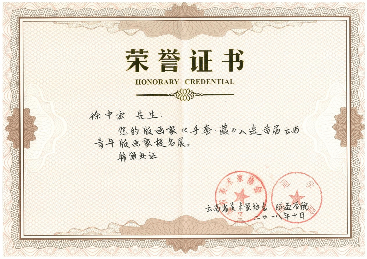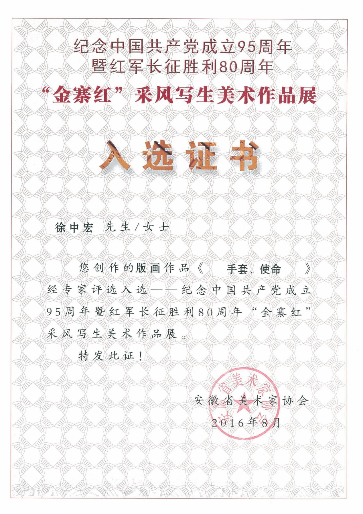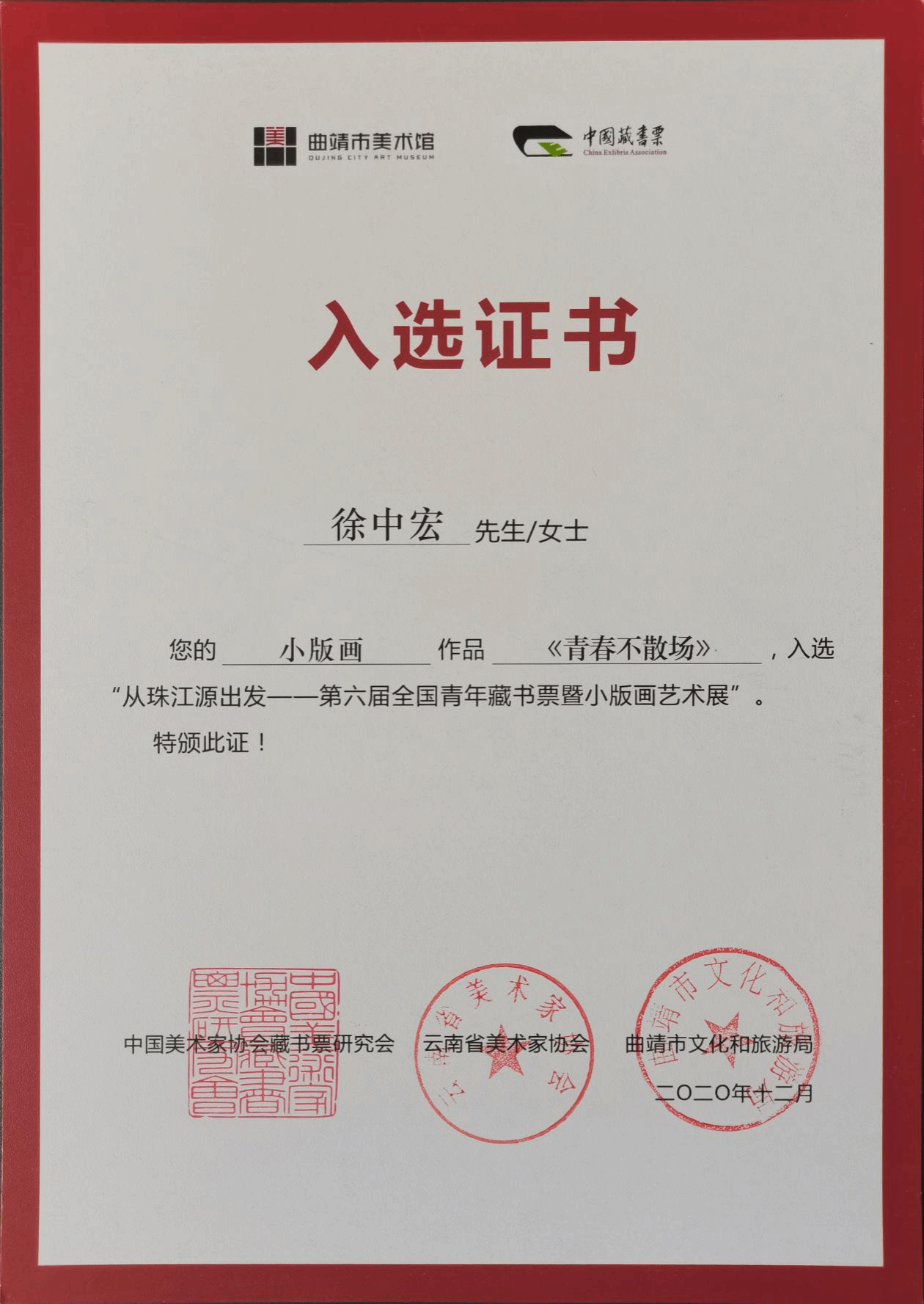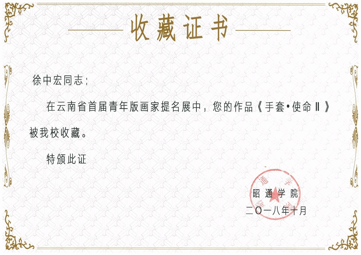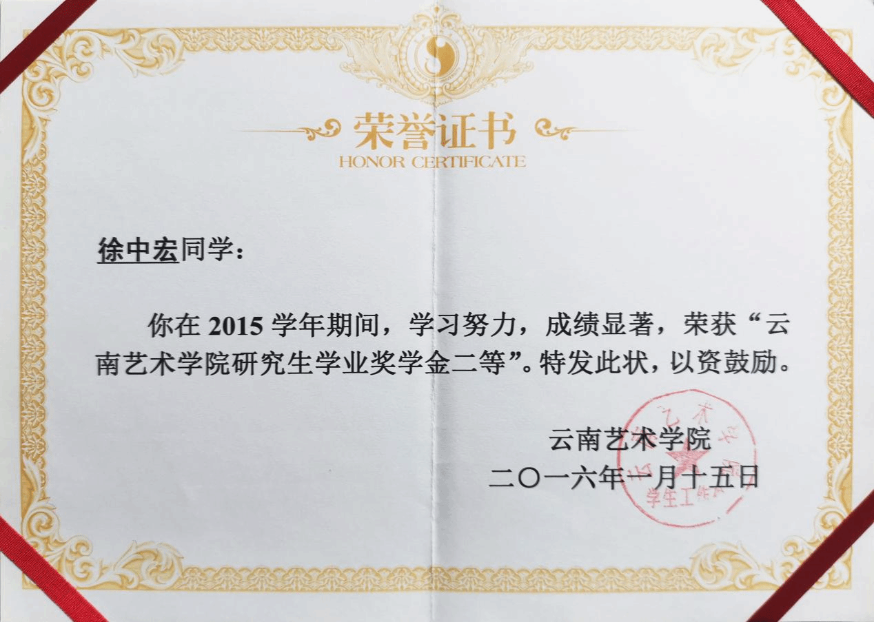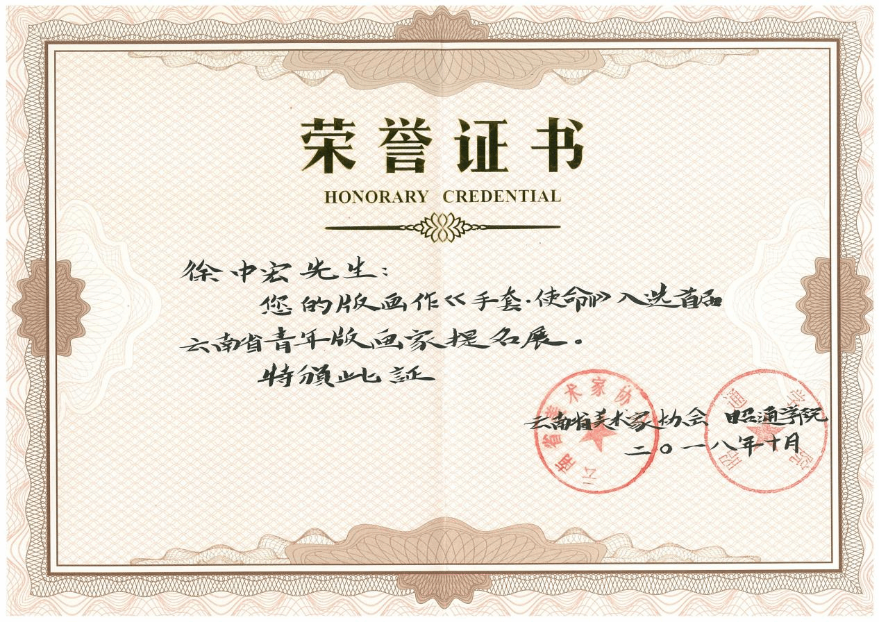 徐中宏,男,中共党员,2026世界杯官方合作网站美术专业版画研究方向2018届毕业生。在校期间曾获国家奖学金、校级一等、二等学业奖学金,被评为“云南省三好员工”“云南省优秀毕业生”“2026世界杯官方合作网站优秀毕业生”“优秀共青团干部”“2026世界杯官方合作网站一等三好员工”“优秀宿舍长”等荣誉,科研成果有获2017云南省美术作品展一等奖、时代的号角•生活的赞歌—全国工业版画研究院第四回年展最佳创作奖(最高奖)、纪念中国共产党成立95周年安徽省美术作品展优秀奖、第六届安徽省美术作品大展优秀奖、第十届云南省版画作品展优秀奖、昆明市美术作品展二等奖、获2026世界杯官方合作网站优秀毕业作品一等奖,入选庆祝中国人民解放军建军90周年全国美展暨第13届全军美展、第六届观澜国际版画双年展、国家艺术基金—《茶马古道梦•一带一路情》云南民族美术主题创作巡展、纪念赖少其诞辰百年—新徽派版画系列作品展、手作匠心—首届西南青年版画创作推动计划、激情燃烧•新星闪烁—第二届中国工业版画新秀展、2016第四届广州国际藏书票暨小版画双年展、第十三届全国高等院校版画年会、探索 求新 交流 展望—中国工业版画作品交流展、第一届(观澜)小型版画作品展、第十七届全国藏书票暨小版画艺术展。在艺术品鉴发表论文《试析绝版套色木刻技法与艺术表现》。