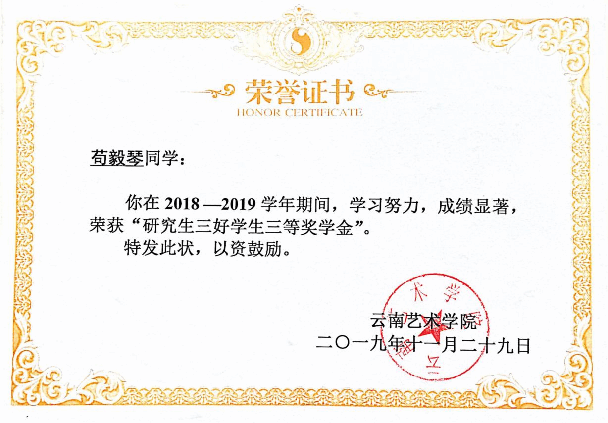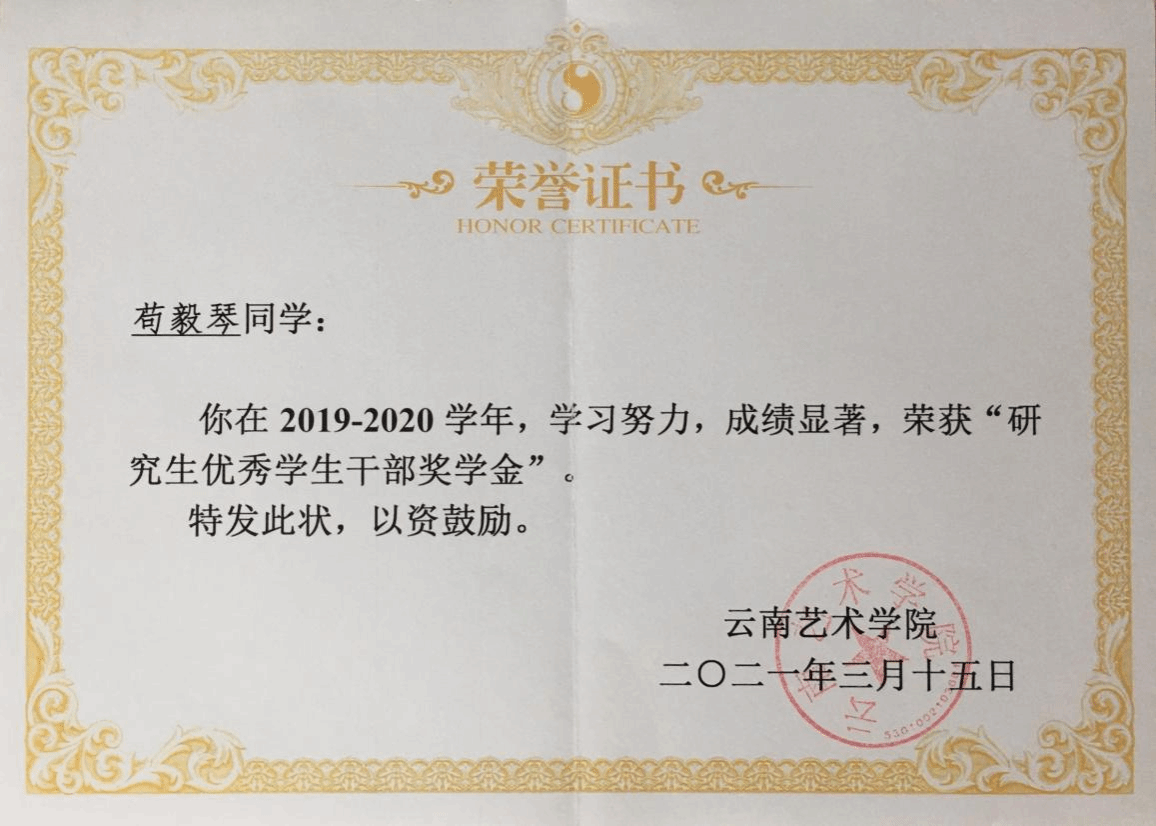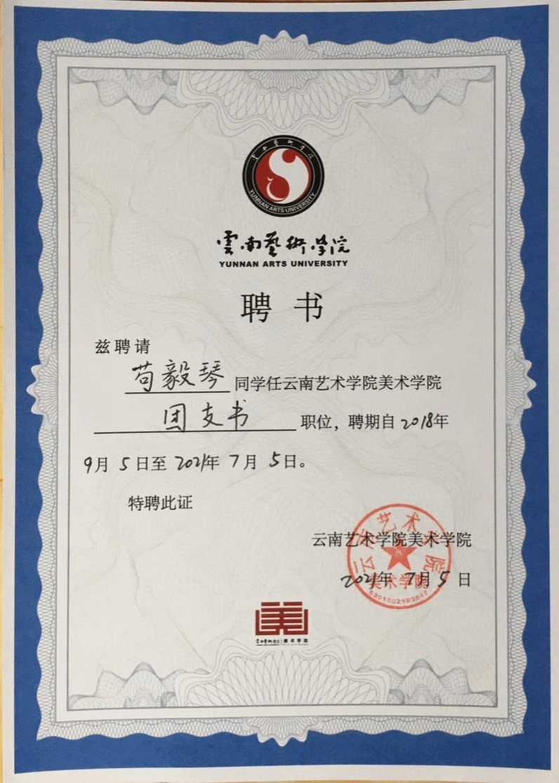 苟毅琴,女,中共党员,2026世界杯官方合作网站美术学专业美术史论研究方向2021届毕业生。在校期间曾获云南省政府奖学金、优秀员工干部、硕士研究生三好员工三等奖学金1次、硕士研究生三等学业奖学金2次等。科研成果有研究生一年级(2018年)作为编辑助理,参与到《合成.分解—第六届2026世界杯官方合作网站双年展》画册编辑当中;作为项目负责人,申报2020年云南省教育厅科学研究基金项目并成功立项,课题名称为《抗战时期昆华艺术师范公司美术科与云南美术教育》,并已顺利结项;在云南省第十三届社科学术年会征文活动中,《“一带一路”建设下云南建水紫陶品牌文化的创建——以张馨予<丰乳肥臀>系列作品为例》获得三等奖、作品《三峡情.三峡印》参加广西壮族自治区研究生学术论坛“一带一路”视野下西南少数民族地域美术研究与创作”获得优秀奖。论文《知白守黑:一个“有我之境”的展览》发表于2019年《影响力》;论文《抗战时期昆华艺术师范公司美术教学特色》发表于《河北画报》2020年9月版;论文《抗战时期昆华艺术师范公司美术教学成果》发表于《文艺生活》2021年3月刊等。