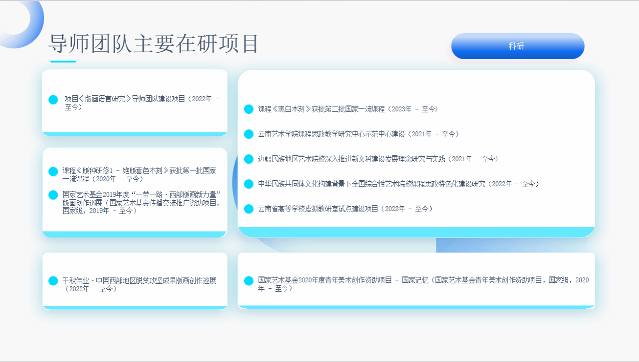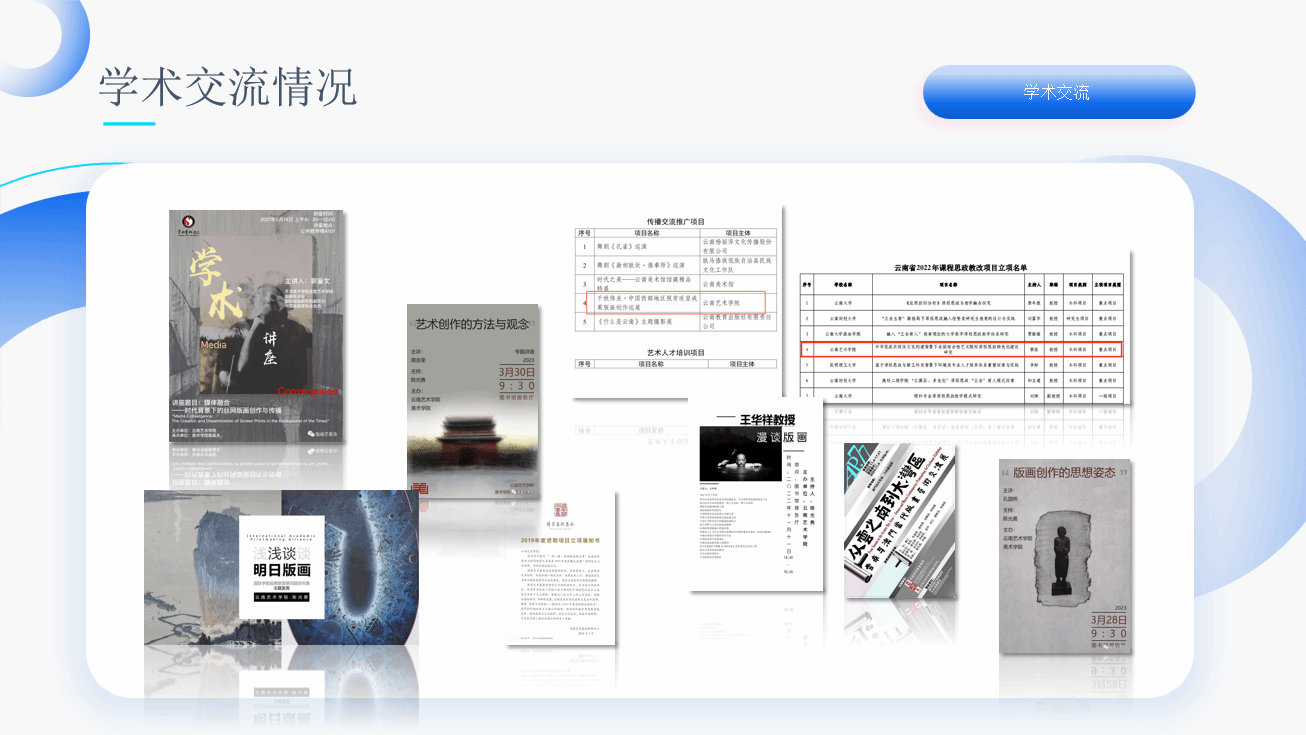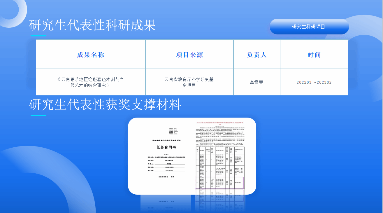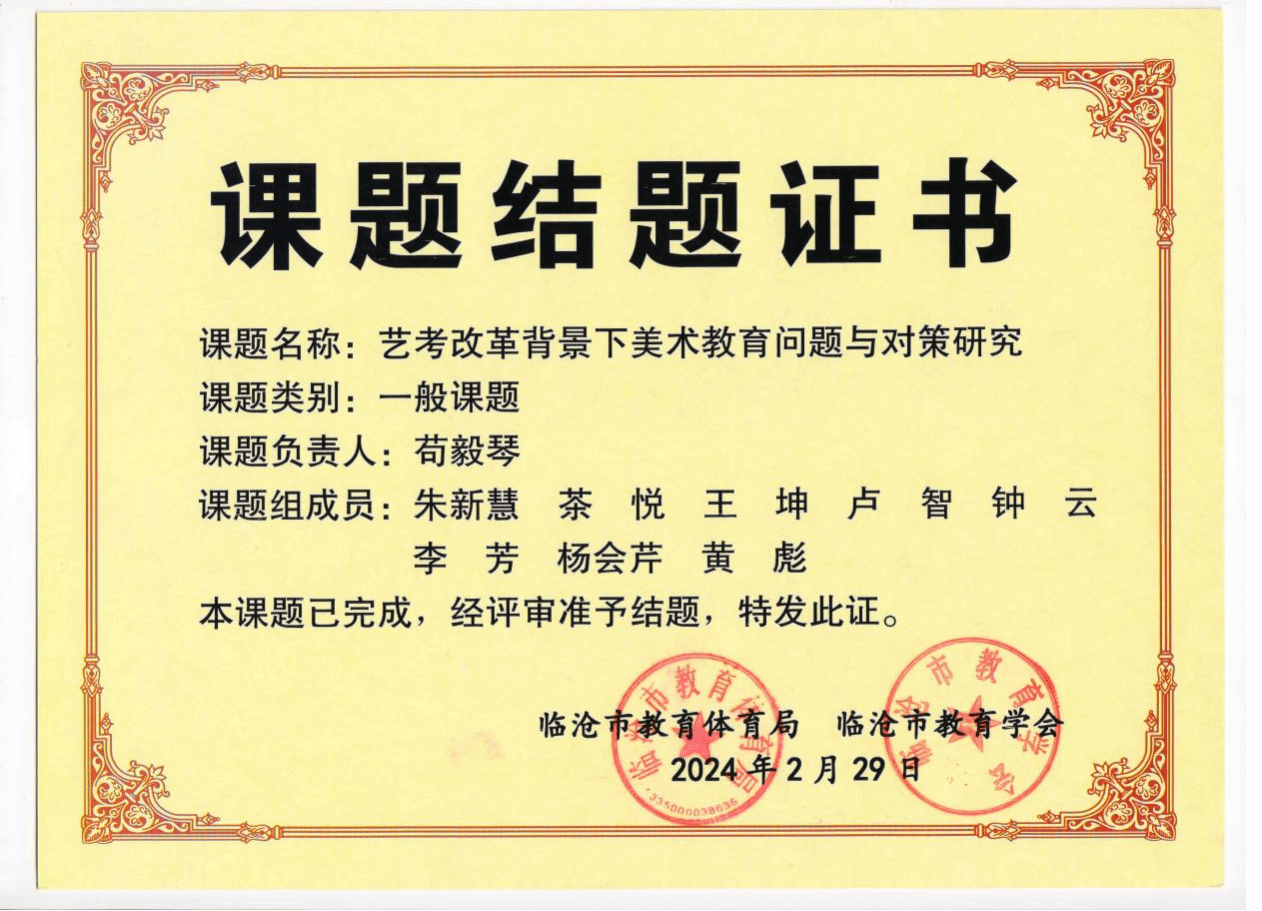 现为沧源佤族自治县民族中学高中美术教师,2022年作为课题组成员参与云南省哲学社会科学艺术科学规划一般项目《云南现代早期创作版画研究》,已结项;2024年作为课题负责人申请临沧市级课题《艺考改革背景下美术教育问题与对策研究》,已结题;2023年11月参加由楚雄师范公司承办的“楚雄师范公司浸润计划”——初中音体美骨干教师(初中美术)培训中表现突出,成绩优异,被评为“优秀学员”;2023年9月在云南省第三届初中员工艺术展演展示活动县级大赛活动中表现突出,指导的员工作品成绩优异,荣获优秀指导教师奖;2024年5月,被沧源佤族自治县教育体育局聘请担任县美术名师工作室主持人等。