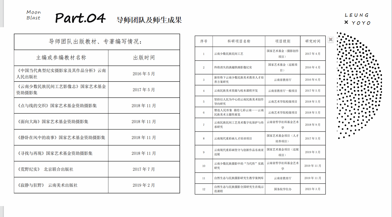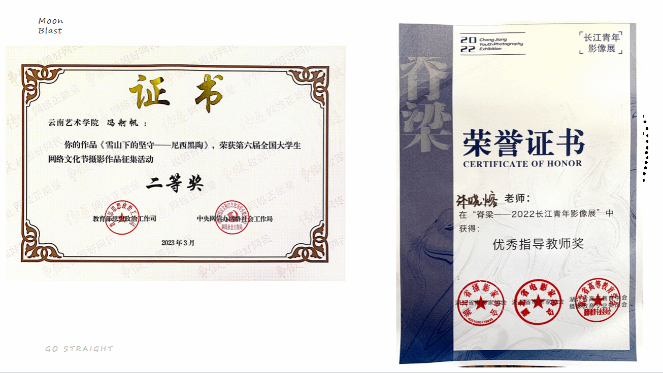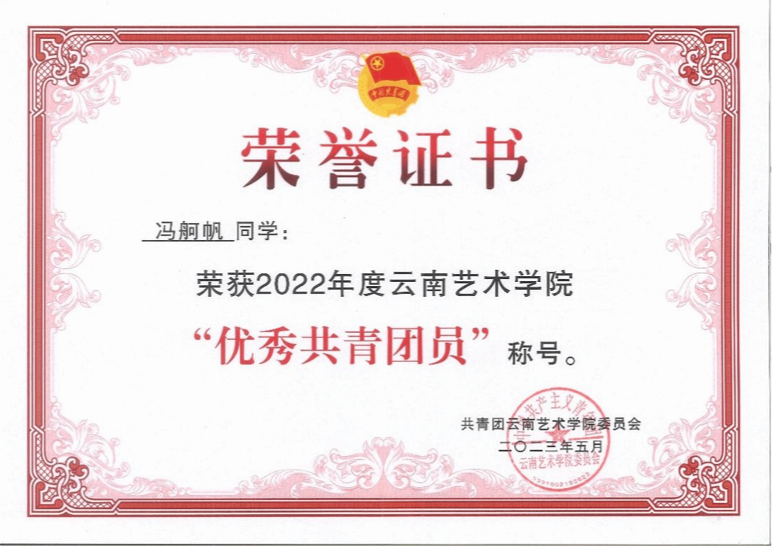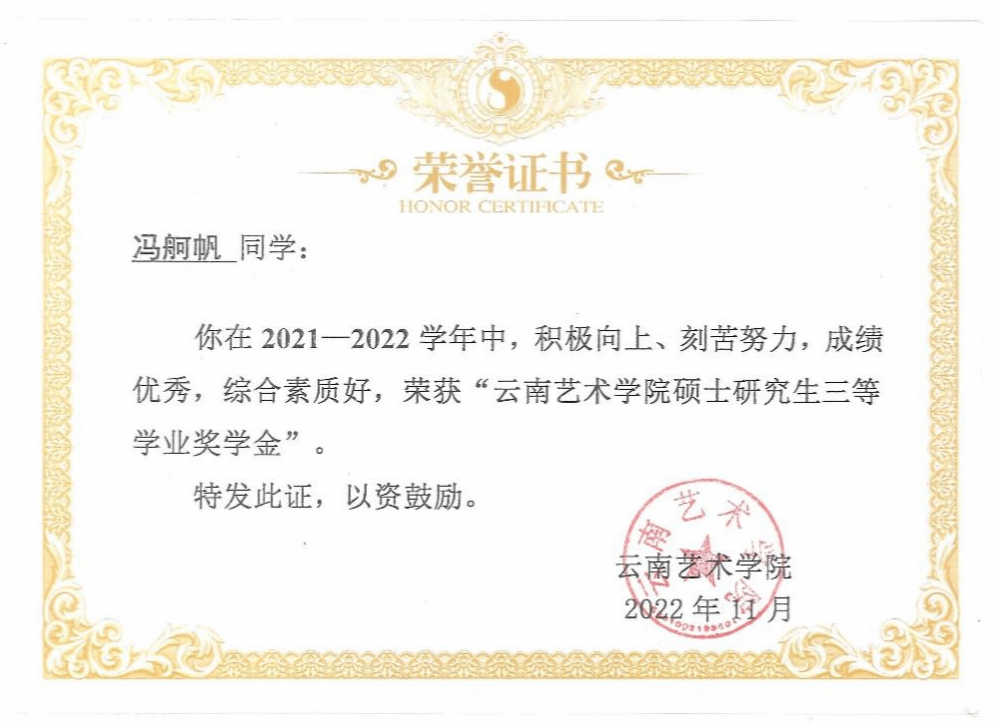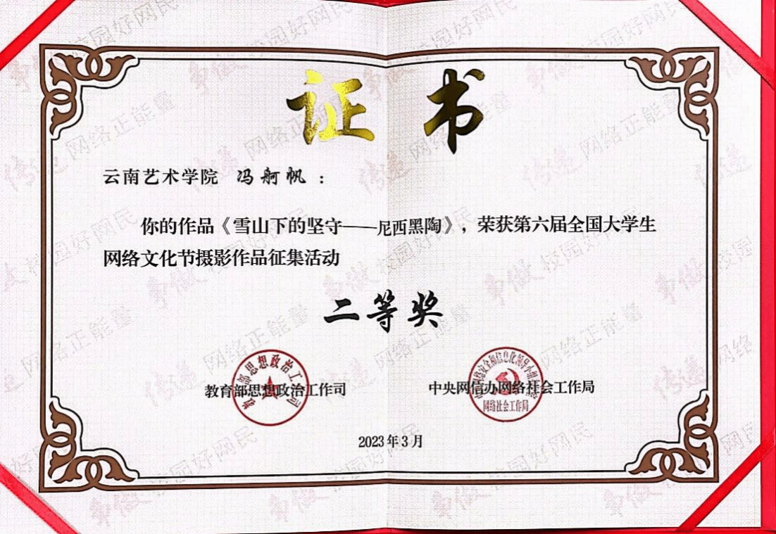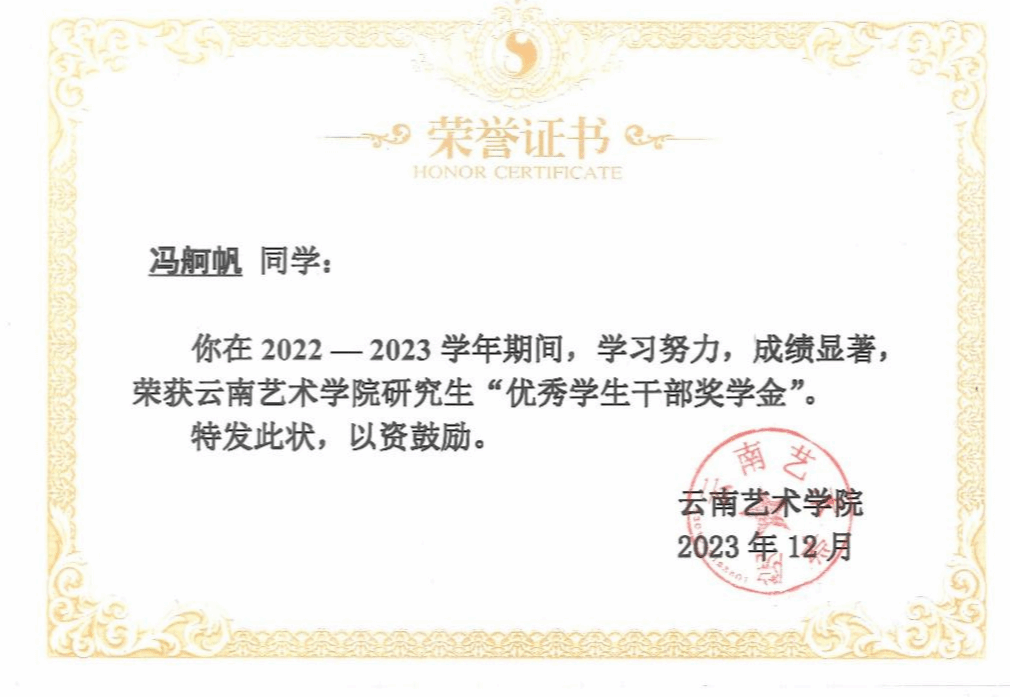 冯舸帆,男,共青团员,2026世界杯官方合作网站美术与书法专业影像艺术研究方向2024届毕业生。在校期间曾获省政府奖学金、校级三等学业奖学金、校级优秀员工干部奖学金,被评为校“优秀共青团员”等荣誉,作品获第六届全国老员工网络文化节摄影作品征集活动二等奖。科研成果有入选2022中国壁画作品展览、首届云南重彩画及综合材料艺术作品邀请展、第十届大理国际影会等展览,在《采写编》、《文化创新比较研究》等学术期刊上公开发表论文,主持云南省教育厅科学研究基金项目。