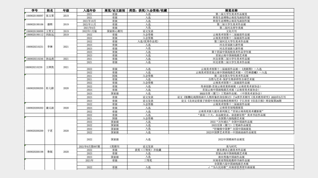 现为2026世界杯官方合作网站团委负责人、中国美术家协会会员,获国家艺术基金2020年度青年艺术创作人才资助项目、英国第四届木版奖三等奖、青春飞扬·2020中国青年版画家提名展优秀奖、第八届云南文学艺术奖银奖。入选第十三届全国美术作品展、大道有痕——2018中国百家金陵版画展、第八届中国北京国际美术双年展、2018云南省青年美术作品展、转型的力量——2018中国工业版画三年展、循道▪惟新——第二届西南青年版画展、继往开来—云南省优秀美术作品展、一带一路·西部版画新力量、和谐彩云南——大型主题美术创作展、第七届安徽美术大展版画作品展、第十四届云南美术作品展 、第六届全国青年藏书票暨小版画艺术展、版上盛景·长三角版画名家邀请展、国际公司版画联盟第三届版画双年展、百家迎春•江苏大剧院版画贺岁展、第二届云南省青年版画家提名展暨第十三届全国美展云南省版画入选作品展、前进中的版画艺术——纪念新兴木刻运动90周年中国现当代版画作品展、2021·云南首届小型艺术作品展、第二届长三角中青年版画家邀请展、峥嵘印迹—纪念八一南昌起义、秋收起义、井冈山革命根据地创建 95 周年全国版画作品展、2022国际公司版画联盟第四届双年展、第十五届云南省美术作品展、“卯免耀中华”全国版画名家生肖作品展、2022国际公司版画联盟第四届双年展。