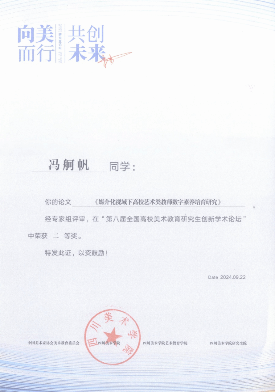 现已升学至河北大学攻读博士学位研究生,为河北大学教育学专业博士研究生,论文在“第八届全国高校美术教育创新学术论坛”中荣获二等奖。