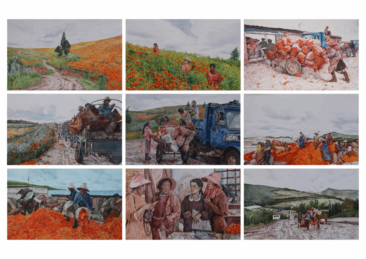 周立明-《红河州万寿菊丰收的日子》-连环画(纸本水彩)-40cm×40cm×9-2024年