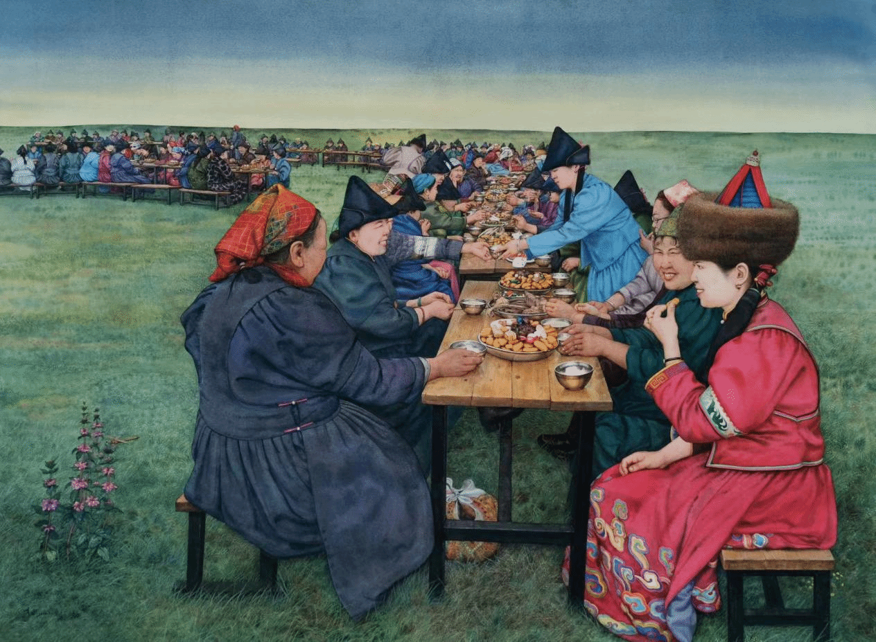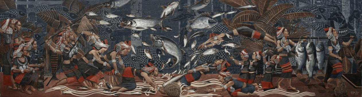 王洪云、彭飞、周扬、陈剑垚、徐洪智、唐洁函、蒋鹏鲲、李一帆-《铸牢中华民族共同体意识——孟连神鱼节》-壁画(布面综合材料)-90cm×350cm-2023年