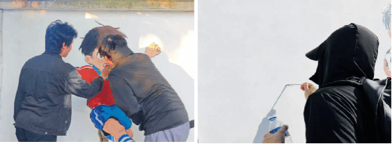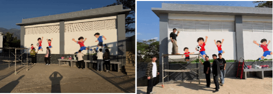 本次墙绘设计紧扣万年塘小学“校园足球特色公司”的办学亮点,以“童真、梦想、奋进!”为核心主题。画面中,孩子们矫健的射门姿态、足球划出的动人弧线与红河县远处的青山、校园风貌巧妙融合,同时也象征美育浸润团队手拉手协作的剪影。鲜艳明快的色彩不仅美化了校园环境,更将足球运动所蕴含的拼搏、协作、规则与快乐理念,以视觉艺术的形式生动呈现,于无声处浸润学子心灵。