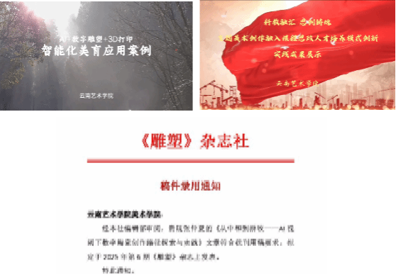 二、在科学研究与创作展演方面,积极发挥校本资源优势,坚持“以人民为中心”的创作导向,注重学科、专业与优秀民族文化的融合研究,彰显主题性雕塑创作的教育美育价值。师生创作的雕塑作品入选《国之大者——中国当代大型主题性雕塑创作手稿巡展》《写意美术作品展》,在中国人民革命军事博物馆、中国美术馆等国家级展馆展出。其中雕塑作品《澜湄之歌》《聂耳》《西南联大——国之脊梁》《西南联大——梁思成、林徽因的家人与友人》4件雕塑作品被中国人民革命军事博物馆收藏。举办教师个人绘画作品展,出版《妙泥——黎广修泥塑艺术研究》著作1部(第一作者)。数字化美育资源和智能化美育应用案例《AI+数字雕塑+3D打印智能化美育应用案例》《科教融汇 思创铸魂——主题美术创作融入课程思政人才培养模式创新实践成果展示》通过省级评审。发表论文3篇。在研云南艺术基金项目1项。依托云南省高校数字化艺术创作重点实验室科研平台在研云南省教育厅科学研究基金教师类项目4项,研究生类项目1项。