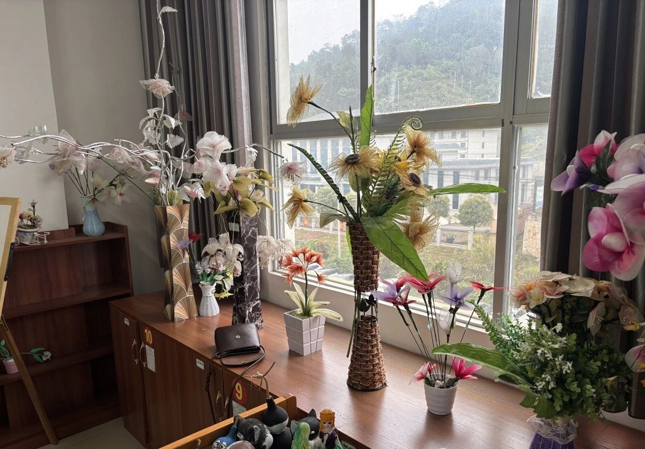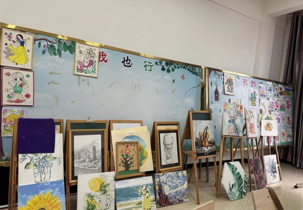 走进教室,我们被这里浓郁的艺术氛围所震撼。展台上摆放着各种手工艺术品,每一件都展现了孩子们独特的思维和创造力;画架上摆满了孩子们色彩斑斓的画作,每一幅都充满了想象力和生命力。特别是聋哑的孩子们,在安静的无声的世界中,通过画笔向观赏者诉说着他们的内心故事。
