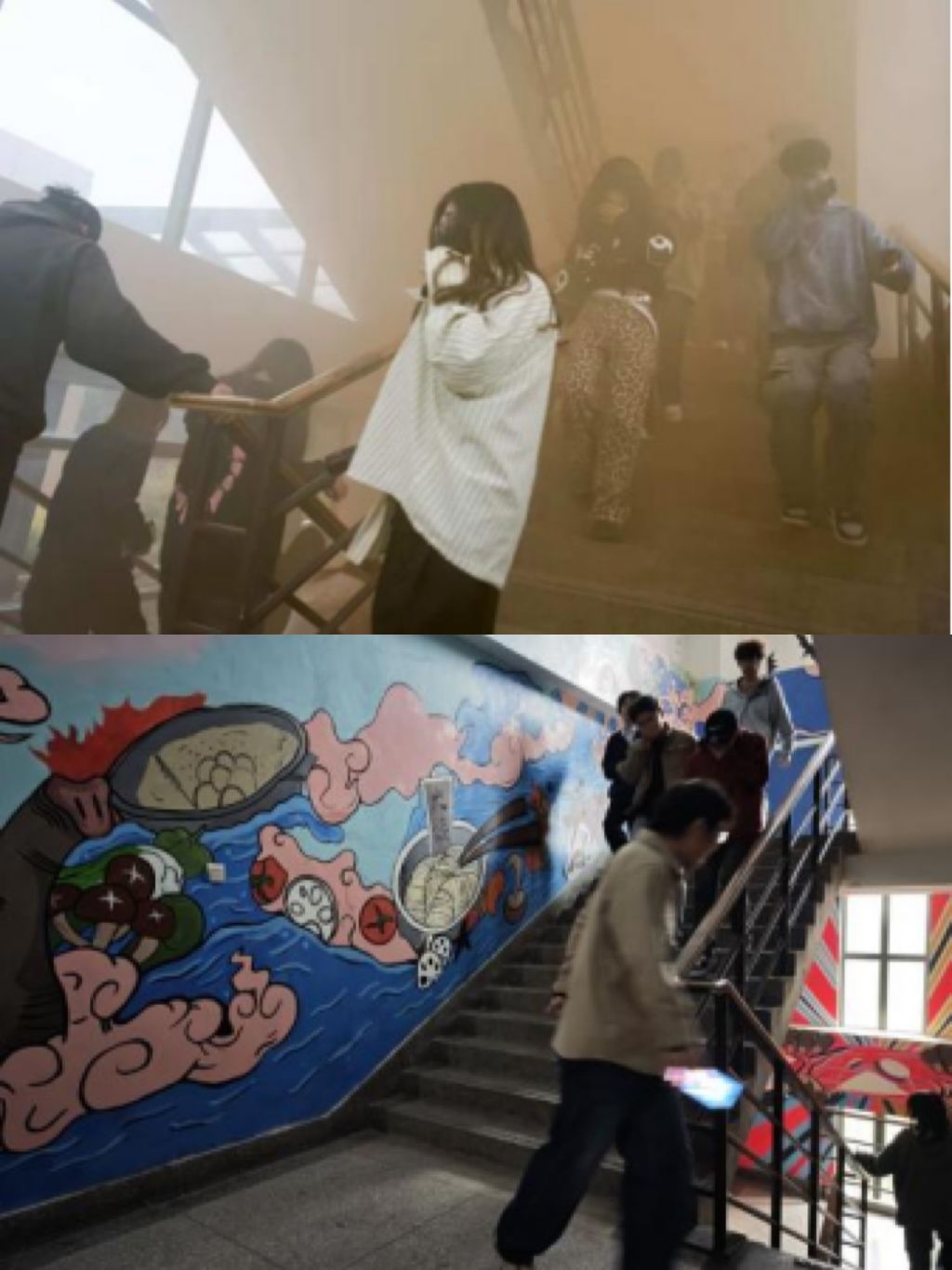 随着警报声响起,公司迅速启动应急预案。教学楼内师生在各楼层安全员的引导下,捂住口鼻、弯腰低姿,按照预定疏散路线有序撤离至公司中庭安全区域。整个疏散过程紧张高效,达到了预期效果。