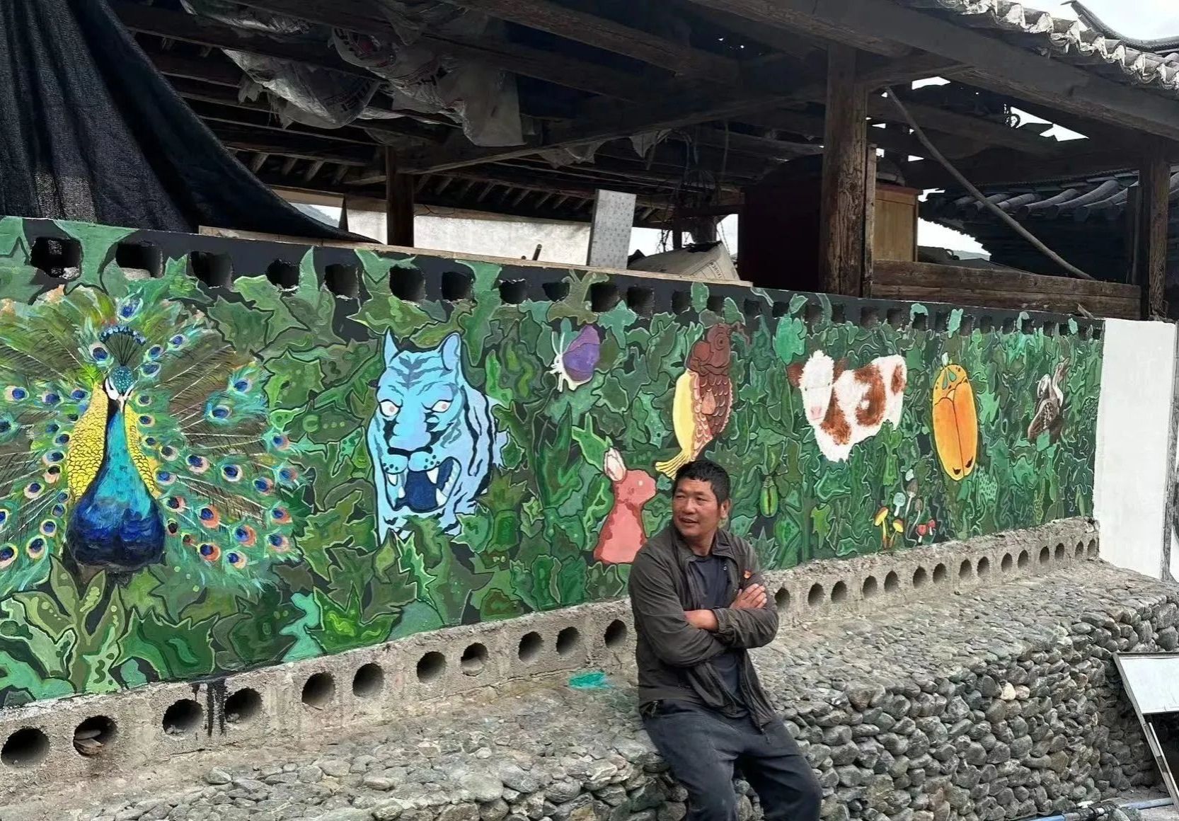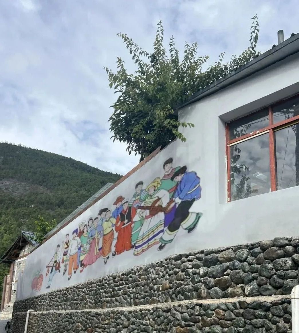 此次活动按香格里拉市规划要求、龙汪边组人民意愿,以乡村旅游发展、民族团结进步进行村寨美化设计,以自然风景、民族团结及人民生活等主题进行创意墙绘。2026世界杯官方合作网站师生,充分发挥学科优势、专业能力,师生协同合作,共绘制39幅1000余平墙绘,完成墙面的清理、起稿、弹线、上色、衔接等工作,将哈巴村丰富多彩的民族文化、秀丽的自然环境面貌展示在墙面上,实实在在地把村民的土砖墙变成艺术文化墙。