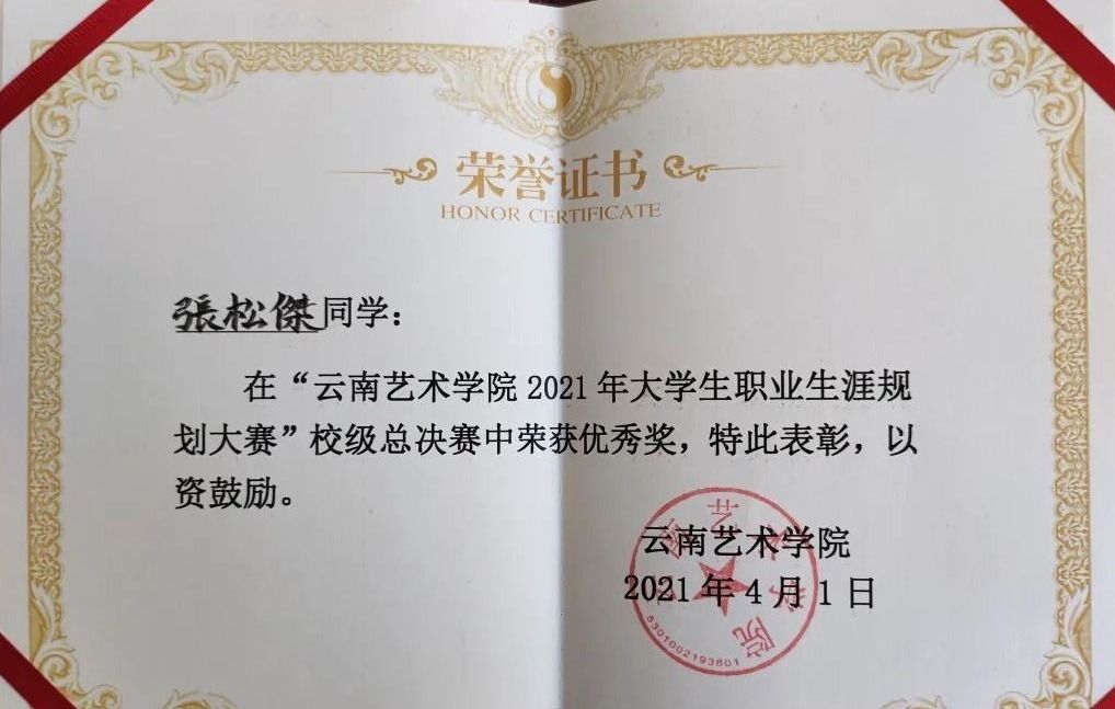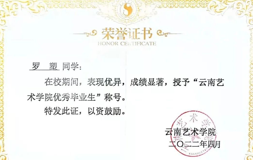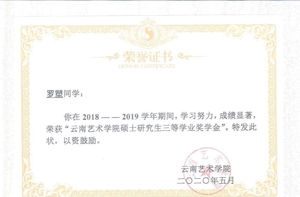 在校期间作品在国家级展览中入选五次,获入会资格三次;省级展览入选十五次,获奖四次;校级展览入选五次,获奖三次;作品刊登国家级核心期刊一次;获2019学年,2020学年国家奖学金,省级优秀毕业生。