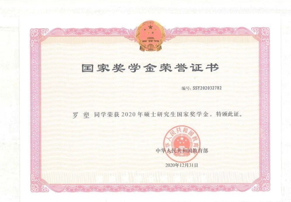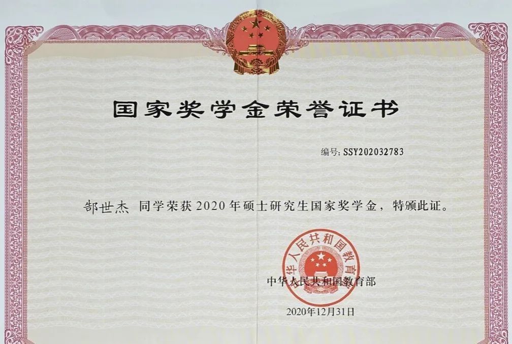 2020年 获得 “硕士研究生国家奖学金”