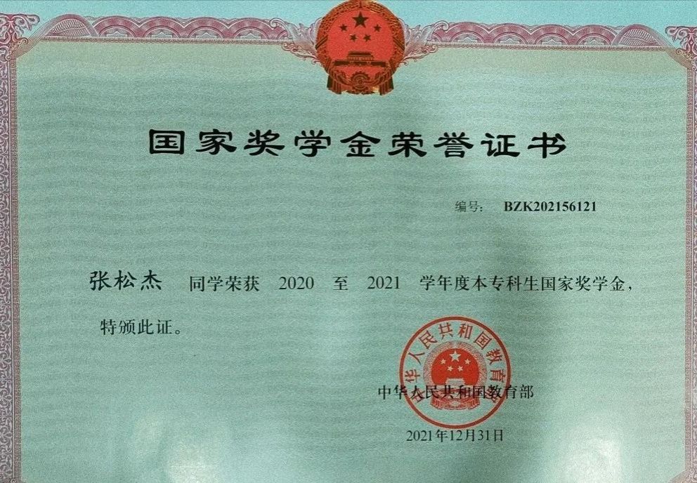 2020至2021学年荣获国家奖学金