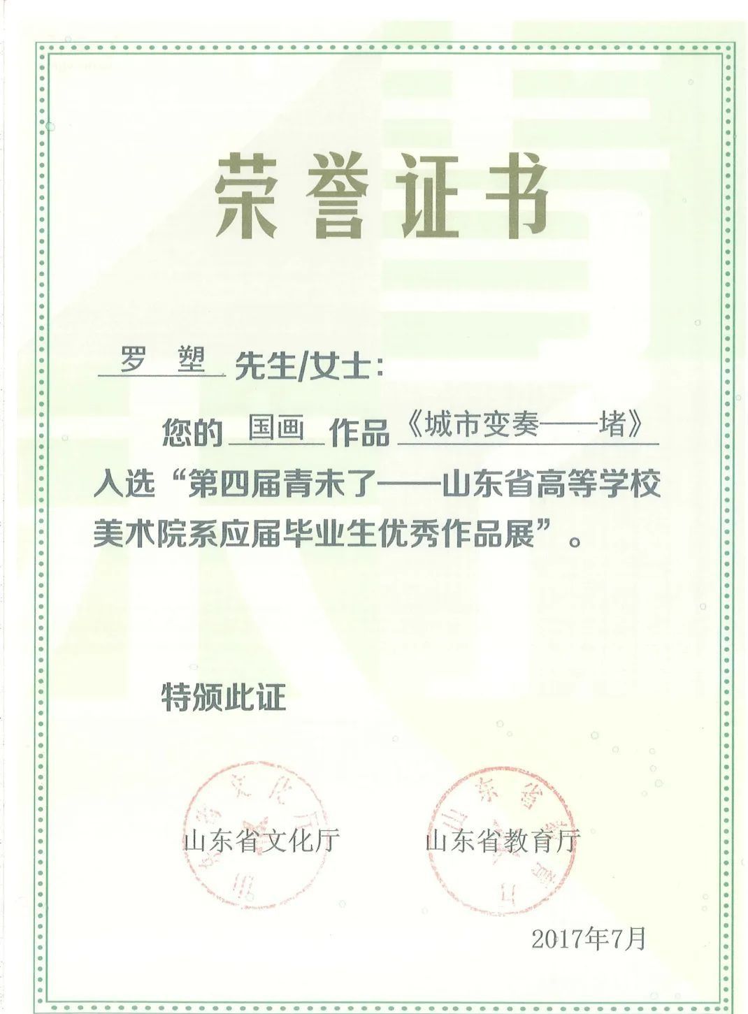 2017年获得第四届“青未了——山东省高等公司美术院(系)应届毕业生优秀作品”艺术奖(最高奖)。