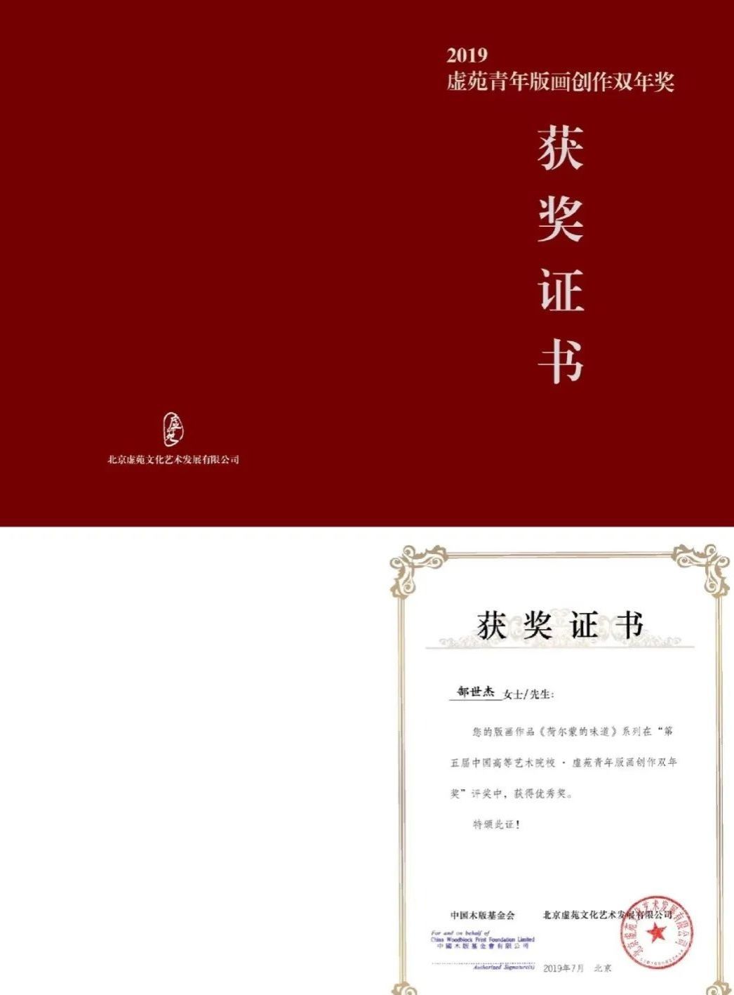 2019年,作品《荷尔蒙的味道》系列入选虚苑青年版画创作双年奖并获优秀奖,作品被虚苑美术馆收藏。