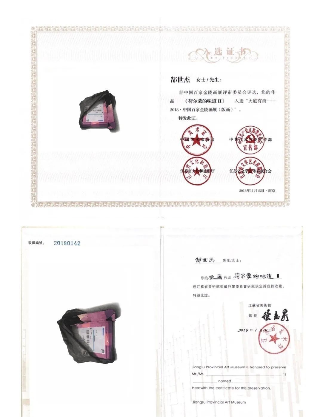 2018年作品《荷尔蒙的味道之二》入选大道有痕-2018中国百家金陵画展《版画》(获中国美协入会资格一次),作品刊登于国家核心期刊《美术》杂志2019.2期,并被江苏省美术馆收藏。