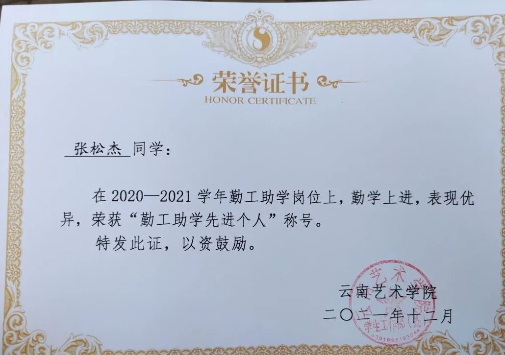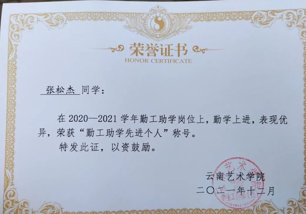 2020至2021学年荣获勤工助学先进个人称号