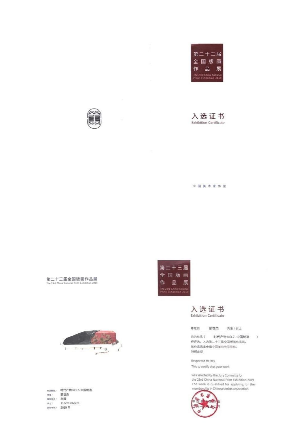 2019年作品《时代产物no.7-中国智造》入选第二十三届全国版画作品展(获中国美协入会资格一次)。