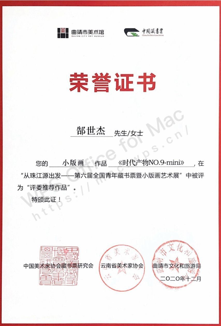 2020年,作品《时代产物no.9-mini》入选第六届全国青年藏书票暨小版画展并获得评委推荐作品奖。