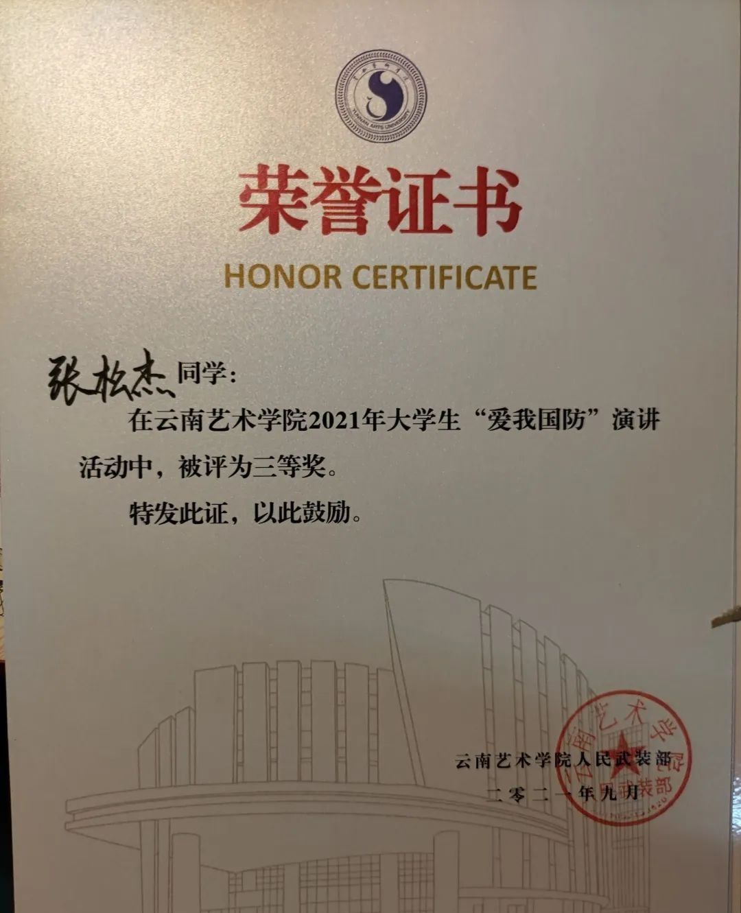 2021年 获得 “省级优秀毕业生”称号。