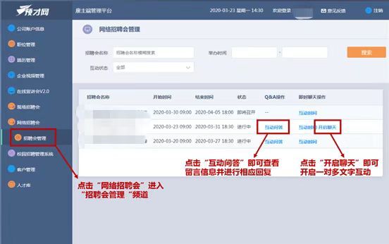 招聘会举办期间,为本场招聘会的企业与员工提供在线互动功能。企业可通过电脑登录雇主端管理平台,进入“网络招聘会-招聘会管理”。